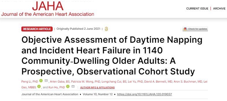 JAHA上发表过一项研究,研究人员对1140名平均年龄80.7岁的老人进行了调查分析,对老年人的午睡习惯进行了14年的跟踪随访,深入研究了午睡时长、频率与心衰风险之间的关系。
